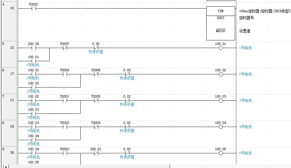 請高手進(jìn)來指教     歐姆龍  CS1H-H 的       5電機(jī)時(shí)序程序    看看 能用不