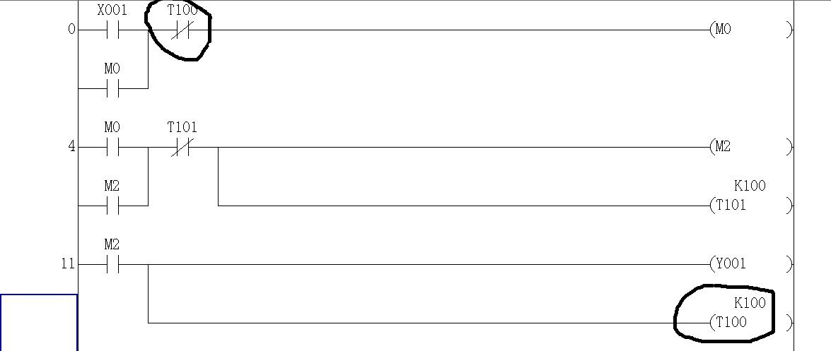 如圖中所示,梯形圖是順序執(zhí)行的,在程序第0行中,有個(gè)時(shí)間繼電器常閉觸點(diǎn)T100,但給T100的時(shí)間賦值是在第11行,所以程序執(zhí)行到第0行的T100時(shí)間繼電器常閉觸點(diǎn)后,是否開始計(jì)時(shí)?延時(shí)10秒后T100常閉觸點(diǎn)斷開?還是?第0行的T100常閉觸點(diǎn)會(huì)一直閉合,直到遇到給T100賦值的語(yǔ)句?實(shí)在是困惑,求解,萬(wàn)分感謝!!