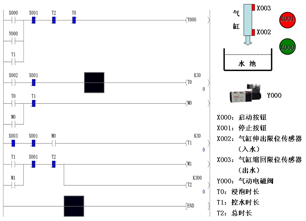 在氣缸的上下位各裝一個磁性行程開關(guān),按下開始按鈕,氣缸伸出或者縮回后,磁性開關(guān)動作,給PLC信號,PLC分別開始計時浸泡時間或者離開水的時間,按下開始按鈕的同時,總時間定時器也開始計時。達到設(shè)定時間后停止就行了。