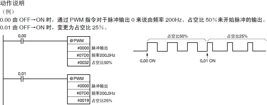時(shí)間的比率。使用PWM 指令從內(nèi)置輸出中產(chǎn)生PWM 脈沖。在脈沖輸出期間可以變更占空比。