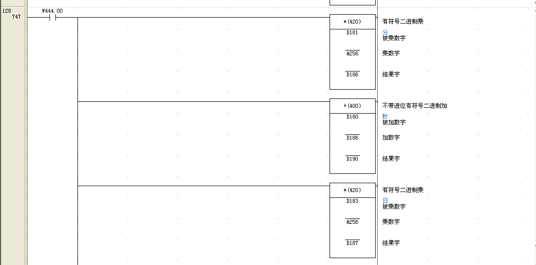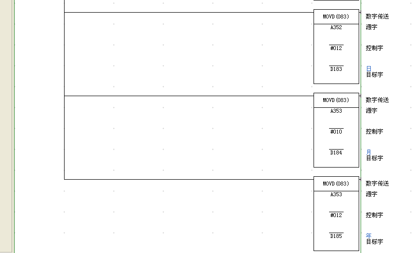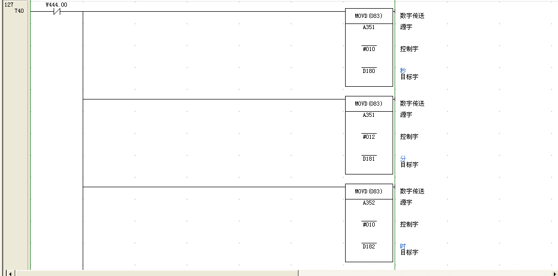 我通過屏幕上一個開關w444.00的置位來調整d180-d185的秒、分、時、日、年,復位之后把調整好的時間在轉換到顯示的字上