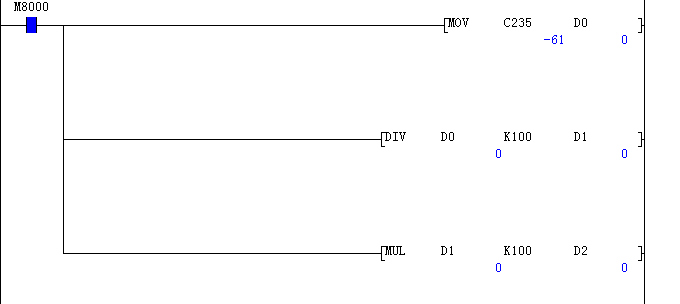 D內(nèi)容改為32BIT DMOV C235 D0 DDIV D0 K100 D2 DMUL D2 K100 D4 |