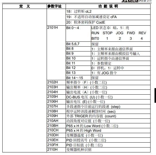 你首先要弄清楚,臺(tái)達(dá)變頻器的參數(shù)地址是以10進(jìn)制表示,還是以16進(jìn)制表示的。否則,你怎么寫(xiě)都是不對(duì)的。就如:寫(xiě)頻率地址是用2102還是用836。這些你都不懂的話怎么做通訊???????