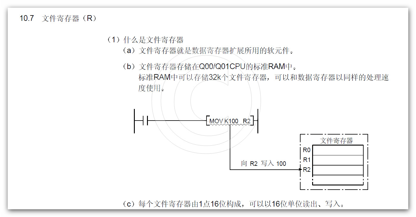 編程手冊第10.7章節好好看看就完全可以使用了,對于低階的諸如Q00等系列,在其使用手冊中對于軟元件R的描述中已經明確用法,對于高階的型號,其使用稍有不同,在其使用手冊上也已經明確說明!!!!!