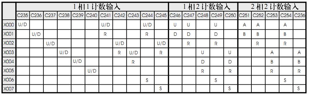 高速計(jì)數(shù)器必須與外部端子X0~X7配合使用,并且根據(jù)高速計(jì)數(shù)器編號占用輸入點(diǎn)的情況,一旦X點(diǎn)被占用后該點(diǎn)不能再用于其它用途。高速計(jì)數(shù)器編號與輸入點(diǎn)的對應(yīng)情況如下表: