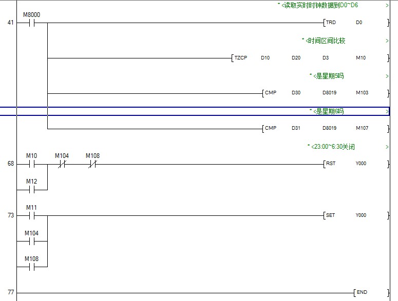 控制要求周日到周四每天23點斷電早上6:30來電,周五到周六不斷電。自己編了段程序如下兩張加一張控制接線圖。