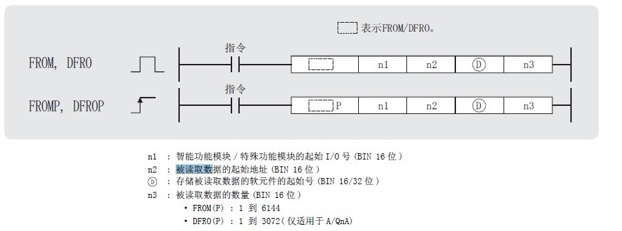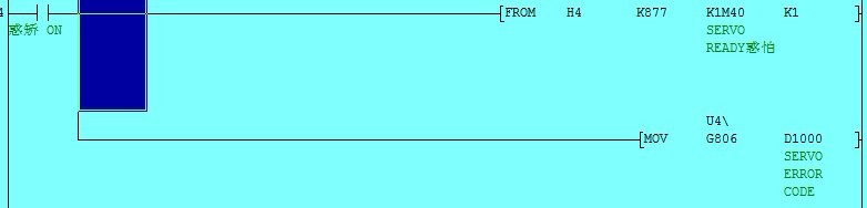 把模塊編號為4(H表示十六進制),BFM#為877(K表示十進制)的緩存器的內容讀取到M40開頭的繼電器組中(K1M40的K1表示繼電器組數,后面的K1表示要傳送的數據點數)。