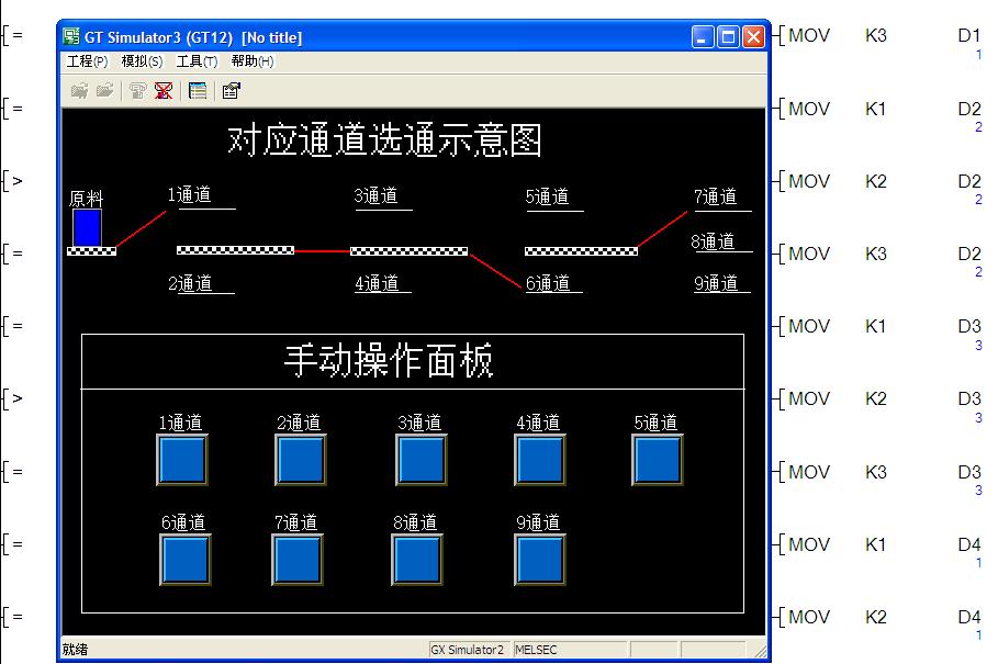 是一個手動操作程序;是這樣的,一個人坐在輸送帶產品進口處,總操作控制箱旁用自己眼睛判斷,手動操作控制120多米長的輸送帶上面的產品對應的12個產品通道,來進行控制分檢,每個通道分一個操作按鈕來坐著手動控制不同產品,不同的規格在對應道口進行人庫包裝。(總控制箱上12個控制對應著12個道口出口)比如;我看到在輸送走來這個產品是3號道口的,我按3號道口按鈕,當輸送產品走到3號道口時3號道口的光電的到信號,汽缸工作門打開產品從3號道口出去。就是這樣只要按對應的按鈕,產品就在對應的道口出去。