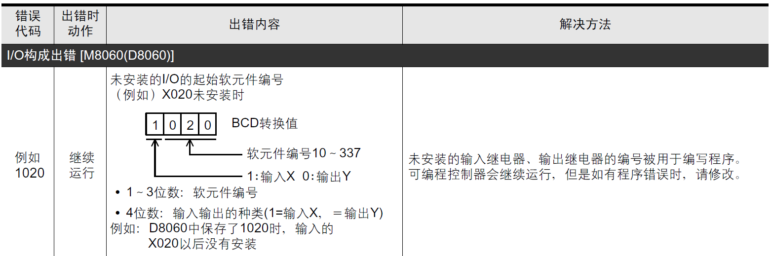 昨天,我拿公司拆下的PLC(型號為FX-2N 32MR),之后將程式輸入(程式內(nèi)容1.LD M8000  2.OUT Y0 3.END),之后發(fā)現(xiàn)PLC Y0的指示燈沒亮,但是Y0輸出的外部指示燈有亮,發(fā)現(xiàn)這種狀況,也把X0裝上去,利用電表確認輸入端有電流輸入,不過X0的指示燈也沒亮,之后用程式診斷PLC后發(fā)現(xiàn),D8060有問題,不過手冊的解決方式看不懂,請大家?guī)蛶兔Π桑匆绾谓鉀Q