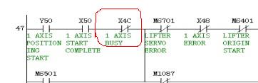 注釋說了,是1#軸的BUSY信號。1#軸的狀態映射到PLC的X4C,來反映1#軸當前是BUSY還是READY。1#軸必須處于READY狀態時,才能對它發出運行指令,否則定位模塊就會報錯。