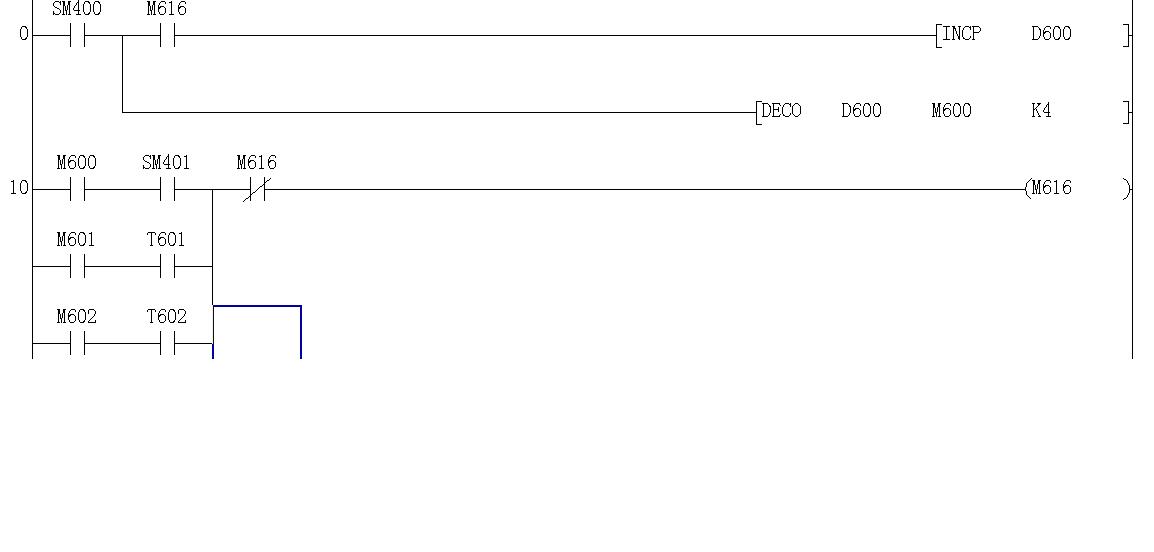 這是個譯碼指令,也就是M600不執行動作的,從M601開始,后面應該還有直接傳送一個1到D600. 樓主查看程序是不是有這個。 樓主留言:沒有,只有那個SM401是執行條件 |