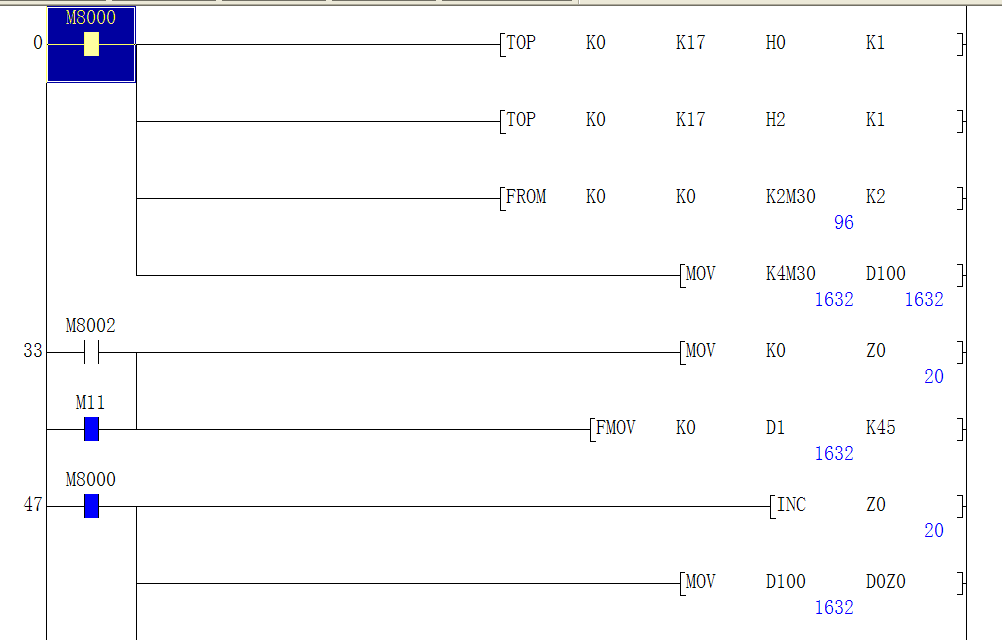 還有就是,為什么第一行的M8000不能持續讀取模塊的值,我試驗過,我手動按鈕操作可以讀取,還有就是每次STOP再RUN之后讀取的值也不一樣,相當于一個掃描周期之后,不讀取模塊值,而下面一行的M8000卻可以自動的INC Z0   請問這是什么原因啊,求指導的~~~~~~下面是截圖