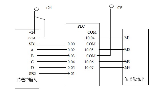A,B,C,D四個傳送帶上,任意一個傳送帶上放上重物后,都會按順序逐個傳送到D帶再結束,四個傳送帶工作時相應的M1,M2,M3,M4燈要同步亮
