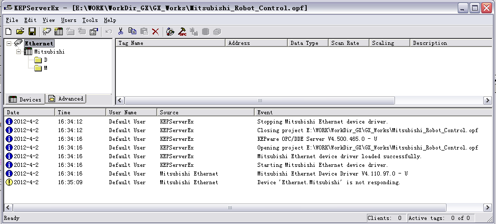 問題:KepserverEX4.5與Q06UDHCPU用網線連接(也試過通過hub連接),建立了若干個M和D的Tag。當PLC運行時,Kepserver顯示——Device 'xxxx' is not responding.