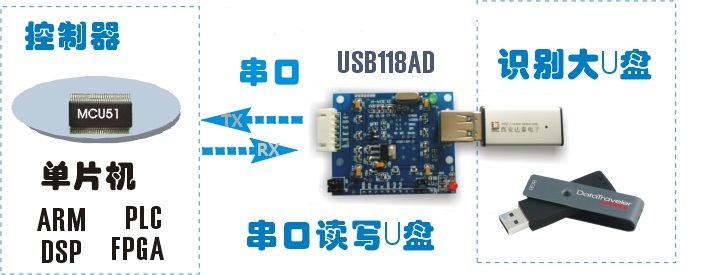無(wú)論是單片機(jī)還是FPGA,只要控制器CPU具有RS232串口,就可以通過(guò)USB118AD模塊的串口實(shí)現(xiàn)U盤文件的讀寫。