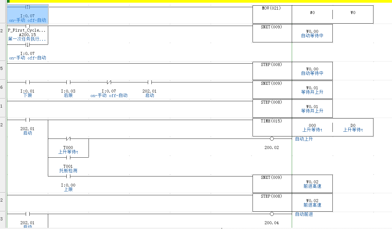 步進控制,簡單的可以,復雜的根本不行。工作量大,建議直接不學習,沒有意義。還有一種是SET  RESET風格,也是不行的。我經歷過全自動生產線,SET  RESET風格,幾十個人,6個月調整失敗的。最后大部分程序重新編寫。步進,SET RESET 風格只是練習用,真正使用根本不行。練習邏輯順序方法有好處。