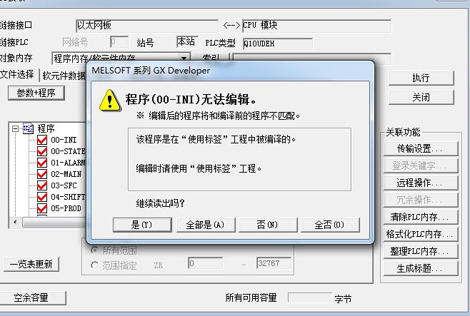 1、三菱Q系列PLC程序上載時(shí) 出現(xiàn)“ 程序無(wú)法編輯 編輯后的程序?qū)⒑途庉嬊暗某绦虿黄ヅ洹保绺郊䦂D2,在上載前,我打開的是以前備份的程序,但是這個(gè)程序是日本人給的,我看到他們進(jìn)行備份的,用的是日文系統(tǒng)和軟件,上載沒有問題。但是我用他備份的程序進(jìn)行上載備份時(shí)就出現(xiàn)這個(gè)報(bào)警,請(qǐng)問這是怎么回事,日文系統(tǒng)和中文系統(tǒng)上載程序有關(guān)系嗎?程序是使用日文編寫的標(biāo)簽。