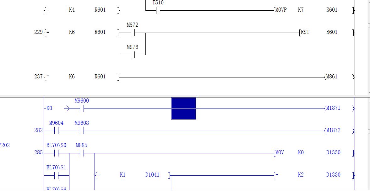 3、上載后的程序,發(fā)現(xiàn)部分程序打開如圖片7一樣,分為兩部分,下面的程序是藍(lán)色的,和上半部分的程序其實(shí)是一樣的,但是校驗(yàn)的時(shí)候就是報(bào)警下半部分的程序沒有?這是為什么?