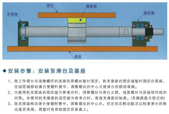 確定 螺桿末端及軸的間隙符合公差之后,最后將滑臺,連接塊,固定端和支撐端鎖緊固定。