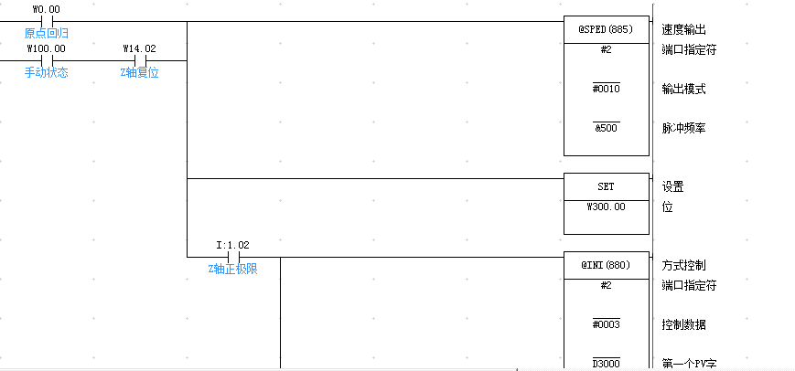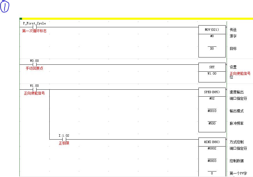 假設正向使能信號為w1.00,反向使能信號為w2.00,先使能 LD w1.00驅動連續型sped #02 #0010  #500輸出(不帶@的SPED叫連續型),驅動電機正向運動。注意你第一句用得@sped這是脈沖型輸出,這個有可能你給的脈沖不夠走不到極限位置。