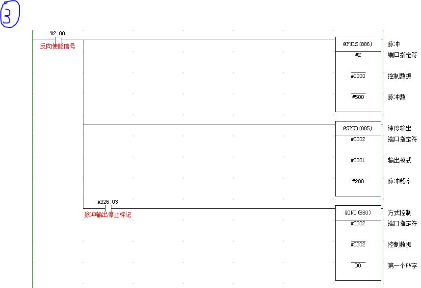 再來一句LD W2.00.    然后驅動@SPED #2 #0000 #200.這里要用脈沖型指令,實現精確定位。