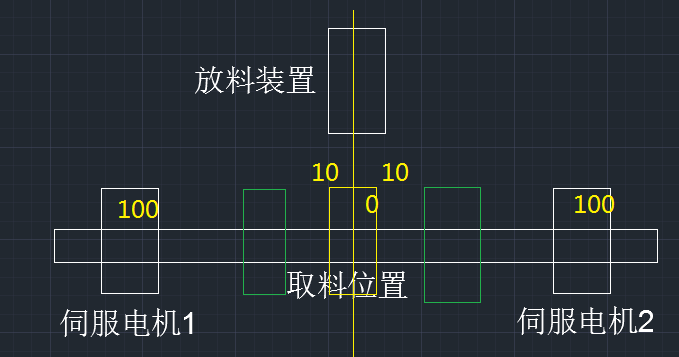 如果左側電機在黃框內,他的位置數值范圍在0至-10內,那么另外的電機先到綠色范圍等待,左側電機出了0至-10范圍,右側電機就過去取料即可。  同理右側電機取料的話,左側也在綠色框內等待。