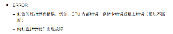 ERROR – 紅色閃爍指示有錯(cuò)誤,例如,CPU 內(nèi)部錯(cuò)誤,存儲(chǔ)卡錯(cuò)誤或組態(tài)錯(cuò)誤(模塊不匹