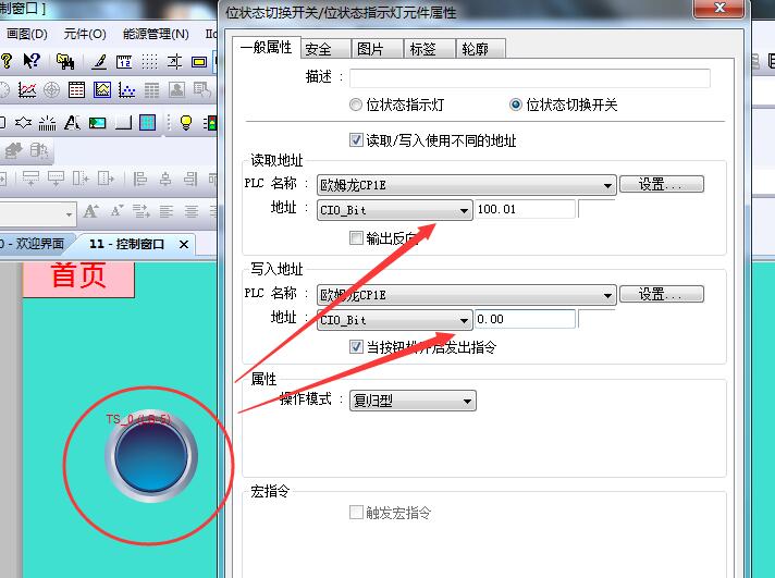 寫入地址就是你要開關的位地址,讀取地址就是這個開關顯示狀態用的,也就是這個按鈕如果是兩個狀態,讀取的為1也就是ON的話就顯示按鈕按下去的狀態效果