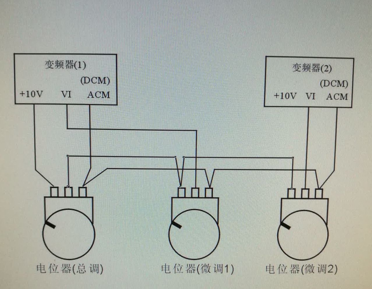 引用引用樓主358137517于2017-11-15 21:29發(fā)表的 變頻器控制問題 :用三個(gè)電位器控制兩臺(tái)變頻器 一個(gè)電位器總電位器 別外兩上電位器為微調(diào) 要怎么實(shí)現(xiàn) 我用的是臺(tái)達(dá)的變頻器