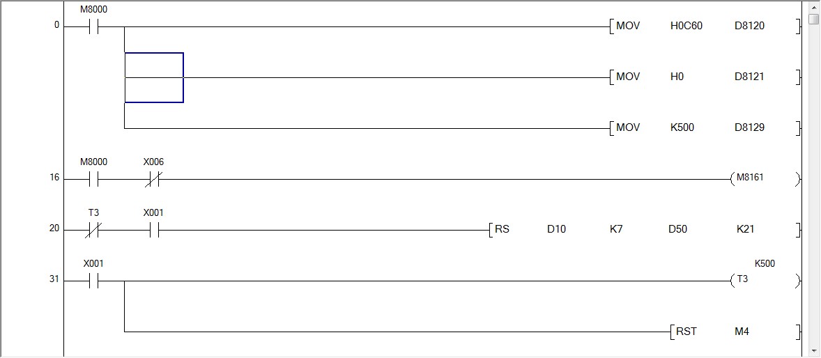 先問清楚一下,X0和X1是不是外接按鈕,或者是觸摸屏的按鈕。如果是,下面的方法有效。如果不是,就另外再說。 第1步,先執行RS指令,且在發送和接收期間要一直執行!例如:X=1,SET M10,M10接RS指令。 第2步,用邊沿指令把數據傳送給發送區。例如:M10的上升沿執行。 第3步,用邊沿觸發指令使M8122=1,發送完數據后M8122會自動復位。例如:M10上升沿的最后一行執行set m8122。 第4步,收到數據后,M8123=1。用M8123=1這個條件使RS指令和M8123復位。例如:M8123=1,執行RST M10和RST M8123。 第5步,讀取RS指令接收區數據。 你的錯誤在于: 1、用按鈕加定時器執行RS指令,很別扭。換句話說,你得一直按著按鈕不放執行RS指令。RS指令的復位靠M8123,因為M8123=1表示收發工作的完成。 2、不能一直使8122置=1,M4=1的時間超過100ms。 3、沒有M8123的復位指令。M8123不復位可能會影響RS指令的執行,以及M8122的置1操作。 [ 此帖被zhangqi_1234在2018-02-27 19:20重新編輯 ] |