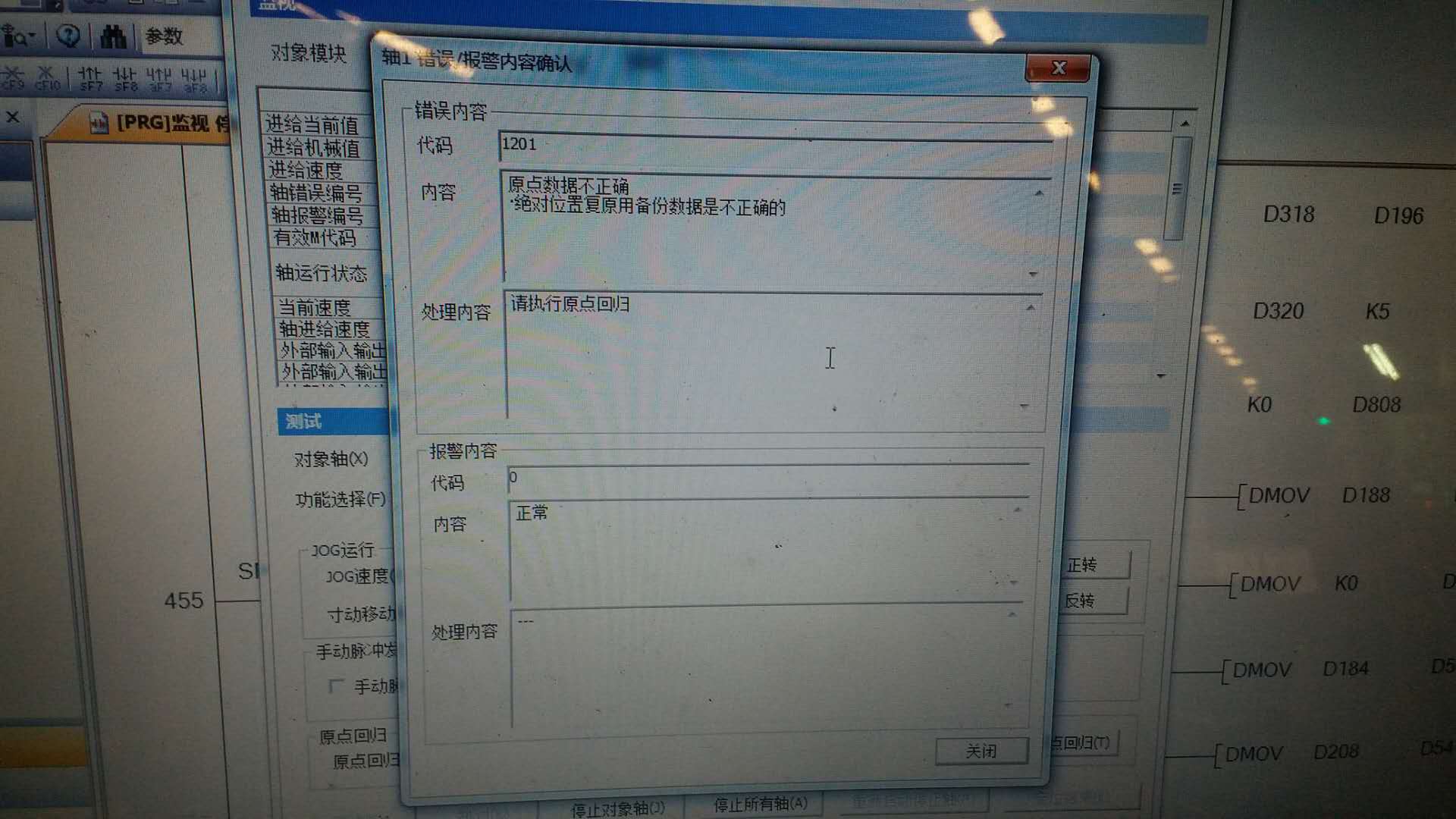 模塊一直在報警,此時又沒原點信息,你故障一復位又會報警,這里有個小技巧,處理一下才能重新回原點。