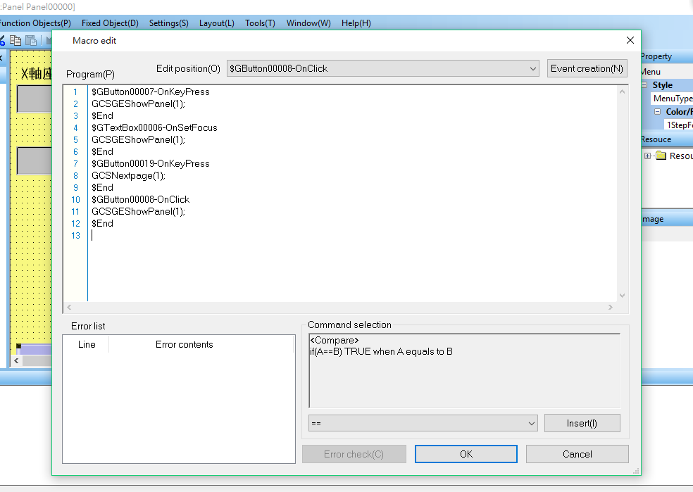 控制器是M70V, 在panel macro edit內寫了一段按鍵的事件, 但執行時都沒反應.