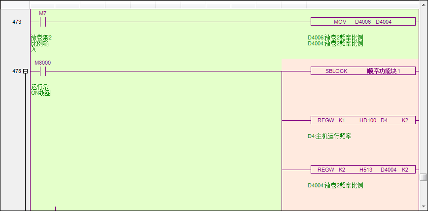 下面信捷PLC 順序功能塊  REGW K1 HD100 D4 K2這條程序是把D4里面的數據寫到站號1變頻器的頻率當中。例如D4里面的數據是50HZ,那變頻器就以50HZ運行。