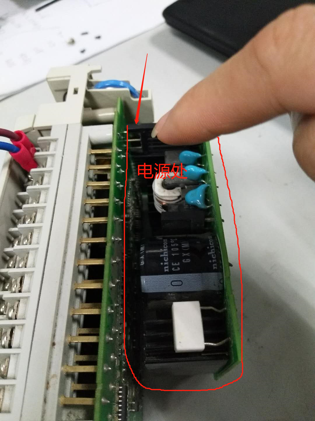 備注:排查過程中以為是兩板子之間的電源接觸部分松動造成的,可是通電后電源指示燈不亮的情況下,怎么晃動板子PLC指示燈都不會亮起,同樣的當拔掉板子后重插,PLC的指示燈亮了后再去晃動板子,指示燈也不是滅,所以個人認為跟兩個線路板之間的電源線沒什么關系。