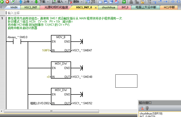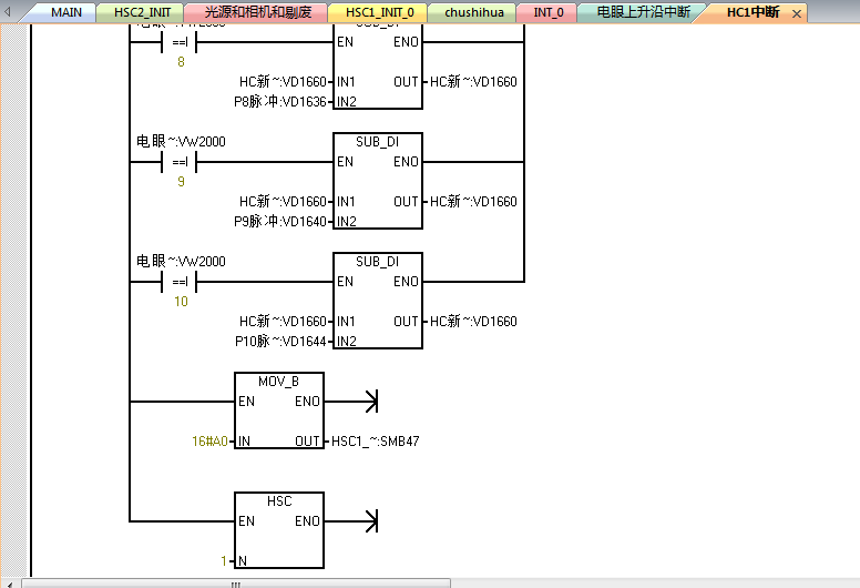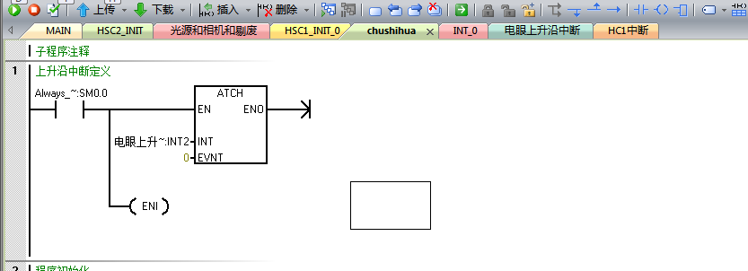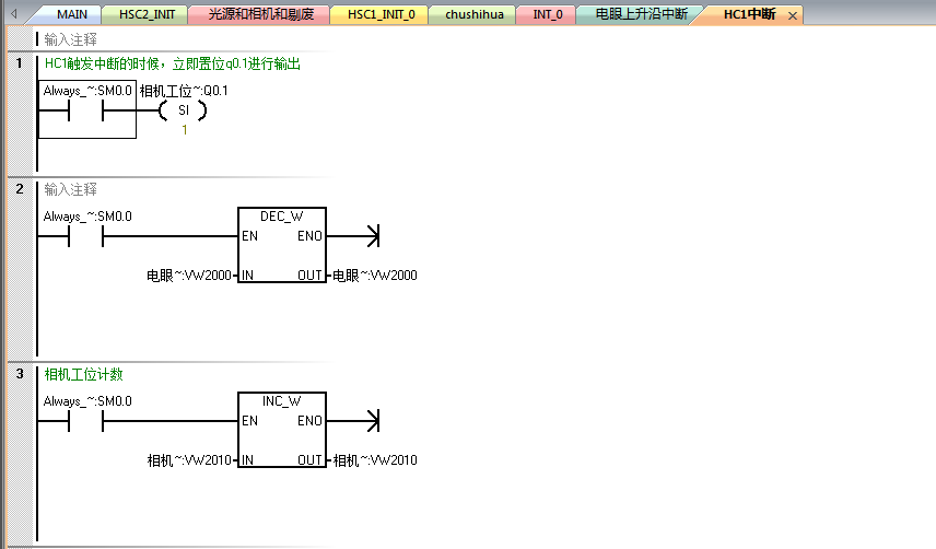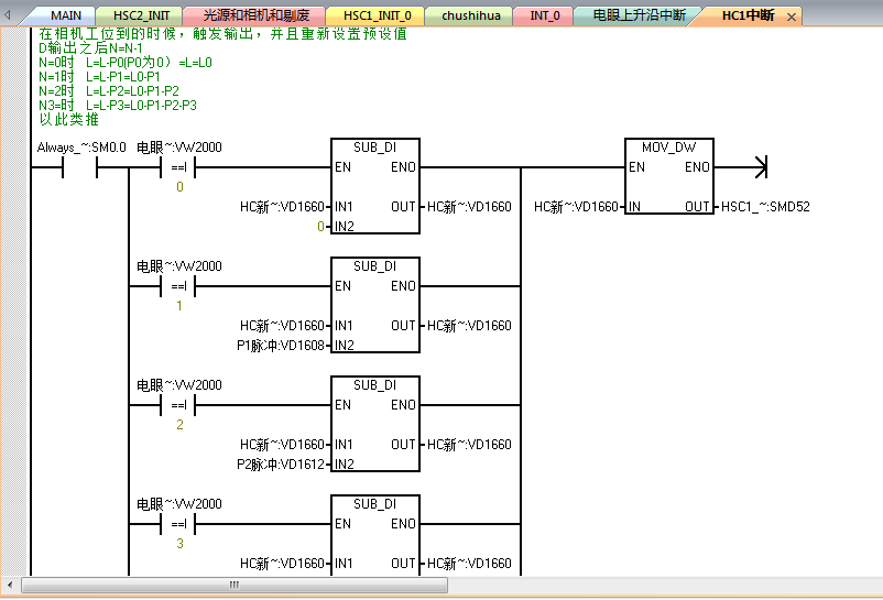 電眼對應I0.0,中斷采用0中斷,也就是電眼發現盒子的時候立即執行中斷程序,中斷程序中采集HC1的數值給VD2000,然后直接賦值為0高速計數器,接著進行數據傳送,最后給HSC1賦新的預設值,在中斷中采用了加法運算,不知道是否可以,,,現象就是我的告訴計數器不知道為什么用這種模式,采集不到數據(排除接線,因為以前的方法直接在主程序采集,都能正常采集數據),還有就是中斷中是否可以包含一些加減乘除的語句,