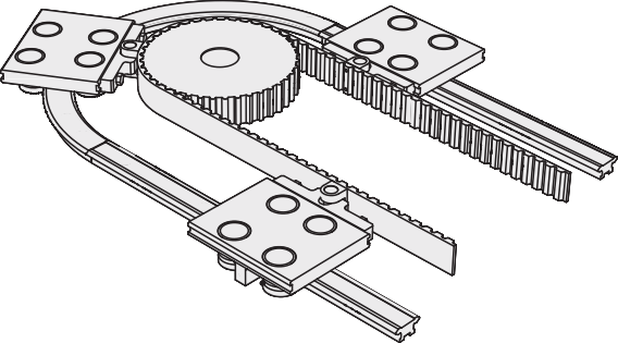 同步帶上安裝有開槽式連接扣件,安裝在滑座上的金屬銷與開槽式扣件嚙合。連接扣件上必須設計長槽,這是為了適應承載滑座從直線運動變為曲線運動時的微小偏移。