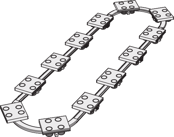 直線導軌和圓弧導軌通過不同的變化組合,可以實現近乎無限種軌道布局形式。生產應用中的典型軌道布局形式有:橢圓形布局、矩形布局、三角形布局、不規則形狀布局。其中,橢圓形布局和矩形布局最常用。