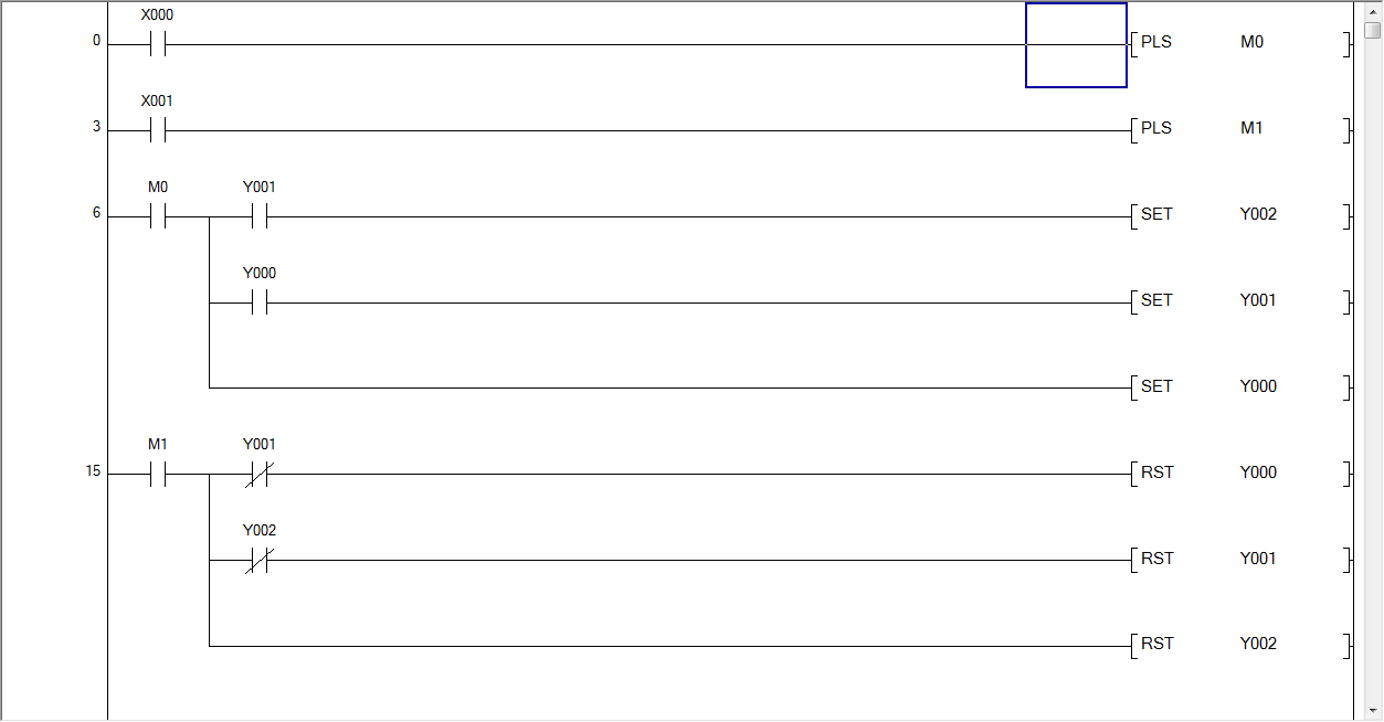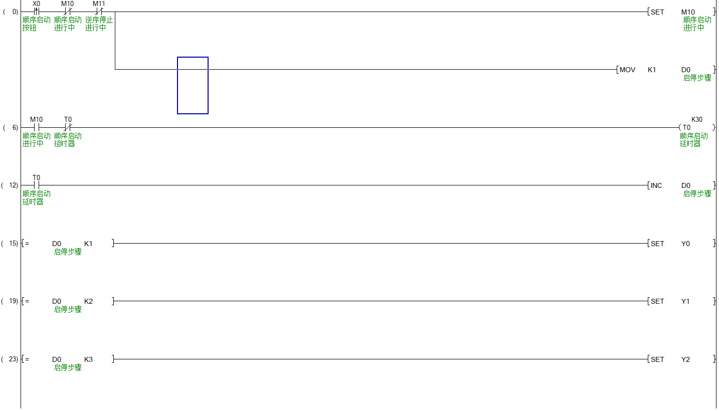 引用引用第2樓fcq417于2019-04-25 08:57發(fā)表的 :樓上的程序是3個(gè)點(diǎn)同時(shí)輸出,同時(shí)停止。你的反應(yīng)沒有掃描周期快的。順序啟動(dòng),逆序停止,可以采用樓主的方式,也可以采用作標(biāo)記的方式,即當(dāng)前啟動(dòng)的是Y0還是Y1等,通過判斷寄存器中數(shù)值來依次執(zhí)行電機(jī)啟停動(dòng)作。學(xué)習(xí)plc編程,www.shuyanzdh.com