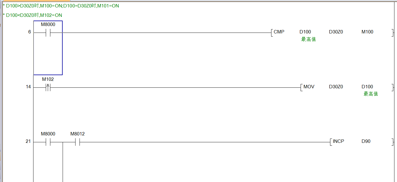 你把采集回來的數依次存到D30--D89共60個存儲器中,再用D100與這60個數據比較,如果新的數據比D100大,就存到D100;