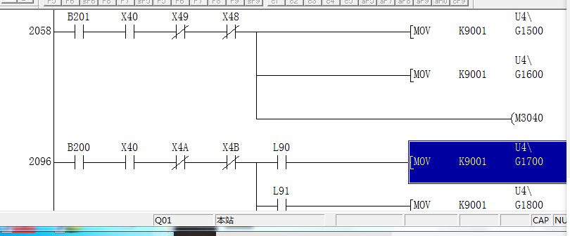 由于沒有接觸過Q系列的PLC,現(xiàn)在又碰到了問題,請教各位大師。三菱Q的PLC,三菱的伺服控制器和三菱的絕對值編碼器。現(xiàn)在停機時間太長了使編碼器數(shù)值保持電池用完,編碼器的零位數(shù)據(jù)丟失了。讀出來的回零程序如圖,但是有幾個地方看不懂,麻煩懂 的給解釋下:B200,B201,L90,L91 ,K9001, U4, G1500,G1600,G1700, G1800.如果要從這個程序上入手使編碼器回零要怎么操作。