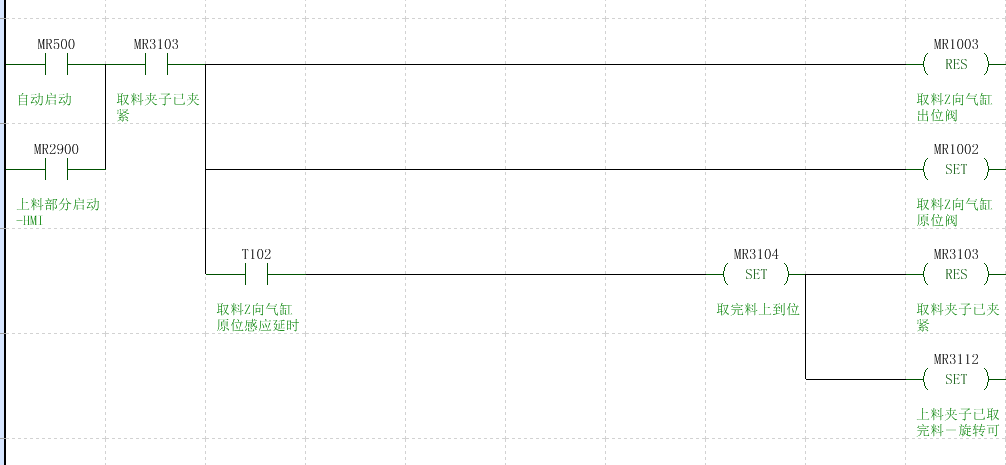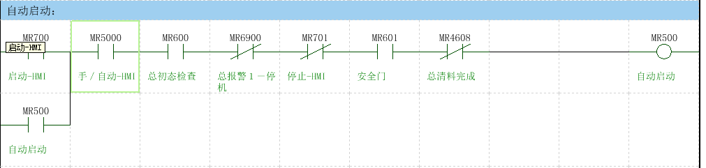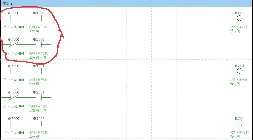 假設你的是單電控的電測閥,如圖所示,當MR5000為ON, MR1000為ON, 則R3000為ON有輸出,如果此時我需要手動自動切換時,當我按下手動自動切換按鈕,MR5000為OFF的時候R3000就OFF了,氣缸就返回了,根本就沒有去按手動的必要了。