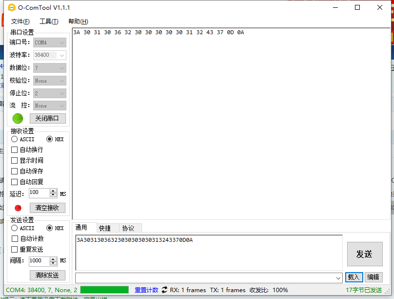 3A是起始符,你缺少0D 0A結束符 所以無響應。應該發送3A30313036323030303030313243370D0A即可。