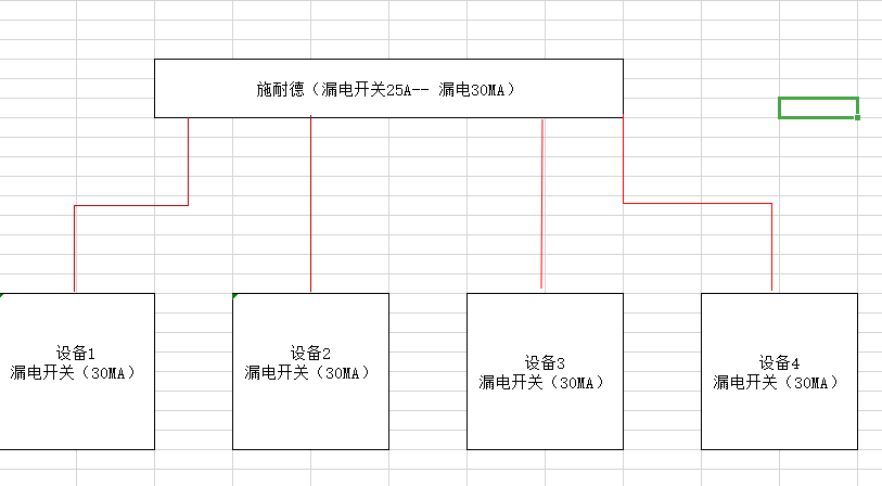工廠有4臺設備,每臺設備均有一個漏電開關(30MA),四臺設備電源線共用一個總開關(施耐德),(如圖所示)。