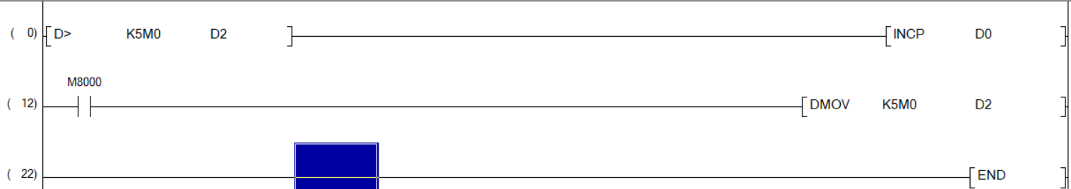 1.用FOR指令,循環(huán)法:實(shí)際上是不斷掃描M0-M19是否接通,通就D0加1,要注意M0到M19不能一直通,只要有一個(gè)一直通就會(huì)不停計(jì)數(shù);