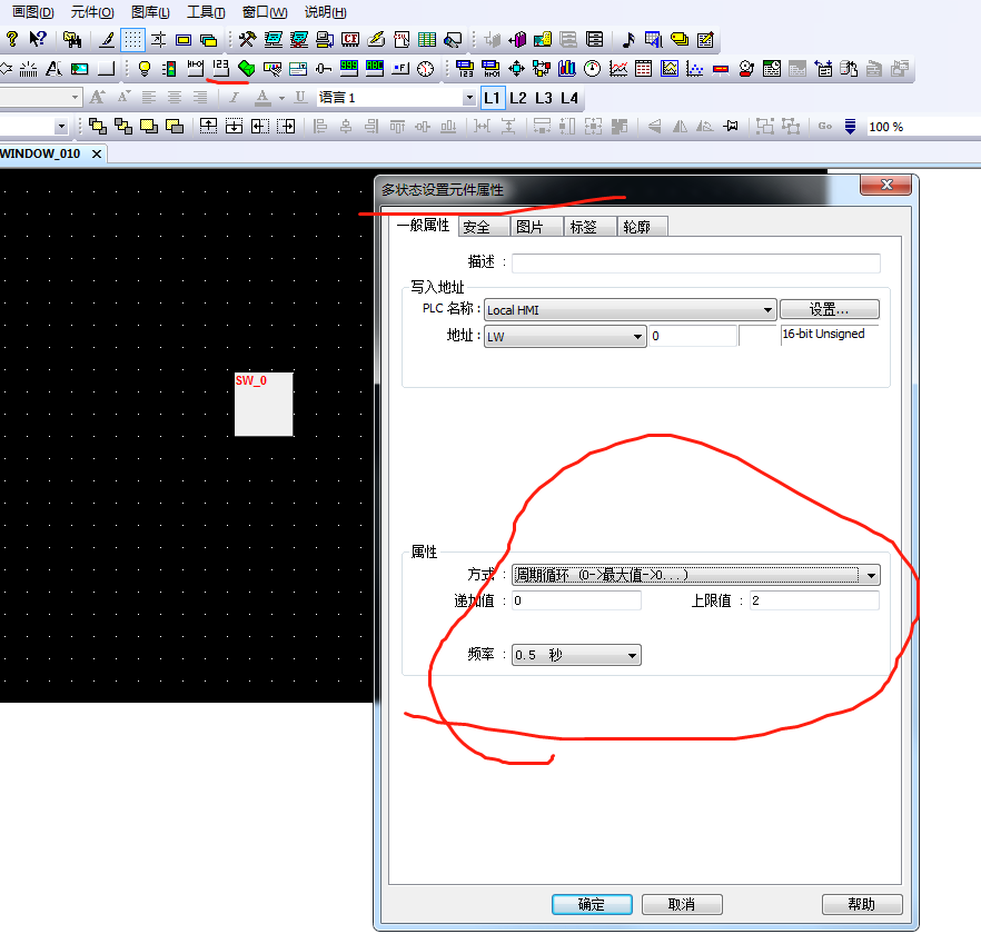 使用多狀態切換開關,設置三個狀態,每隔狀態所對應的數值分別為0,1,2.在標簽頁設置三個狀態的標簽,分為手動工作,單次模式和循環模式。這樣就可以了