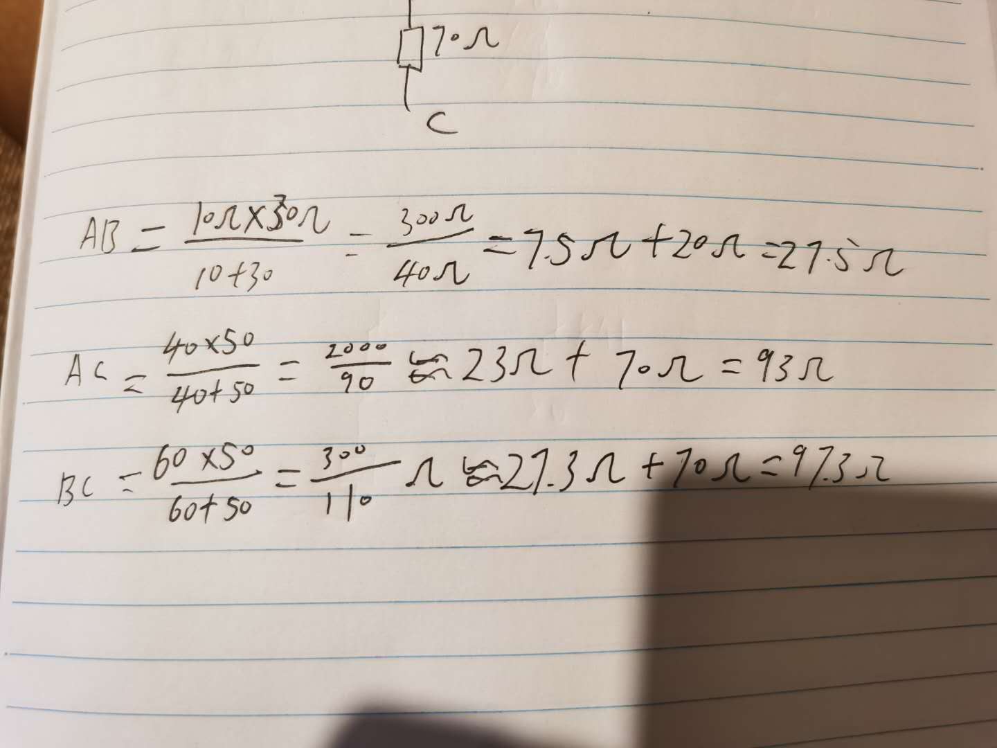 AB之路計算完了,還要計算并聯A---C(70歐上端,下同)---B回路電阻值;
