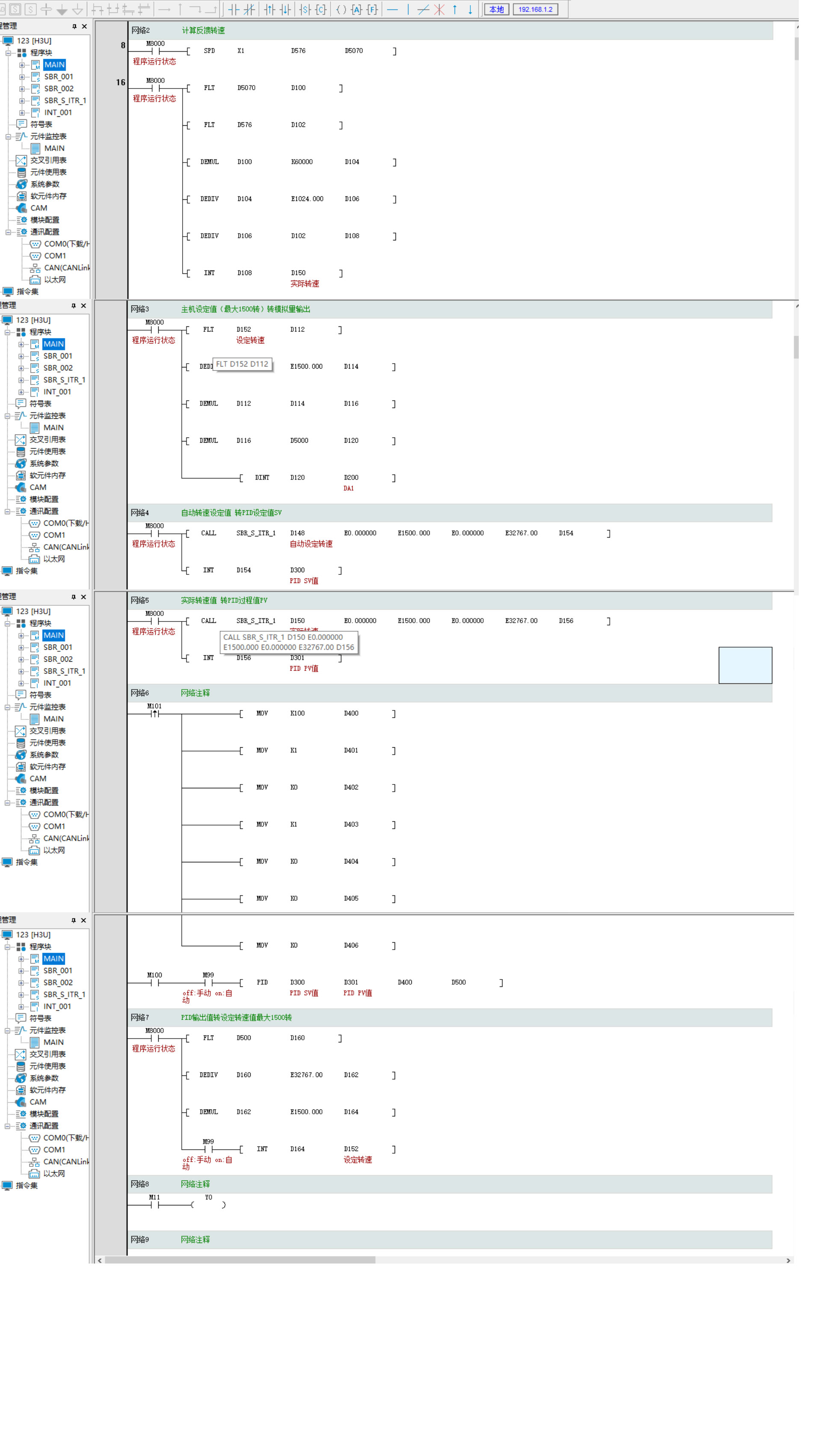 工況說明:變頻器驅(qū)動(dòng)電機(jī)轉(zhuǎn)動(dòng),電機(jī)加裝編碼器反饋給PLC,做為PID控制器的PV值,與設(shè)定值SV(轉(zhuǎn)速)進(jìn)行PID運(yùn)算,輸出控制變頻器,使電機(jī)穩(wěn)定在SV值運(yùn)行。(匯川3U的PLC)