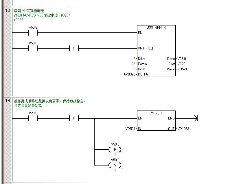 SR20帶7臺G120XA變頻器,走USS通訊,一個子程序中使用7個USS_CTRL指令讀寫變頻器。另一個子程序中使用7個USS_RPM_R指令輪訓讀取7臺變頻器電流,現在問題是: