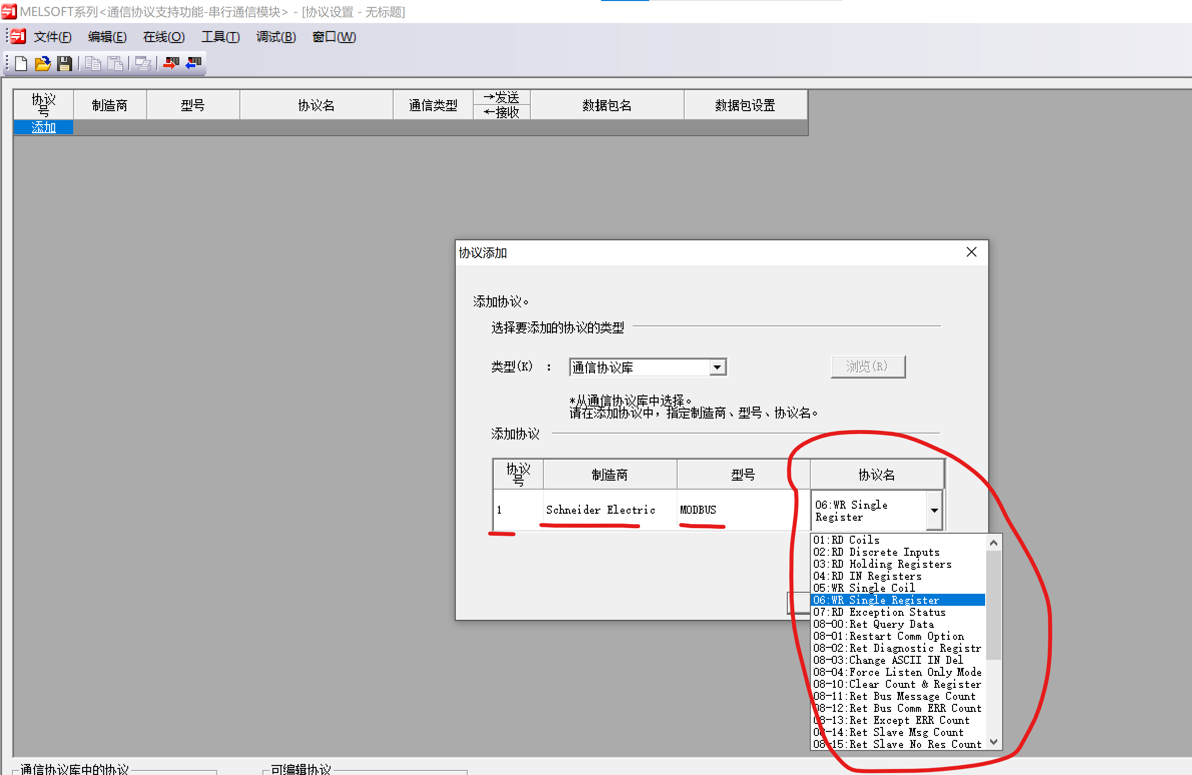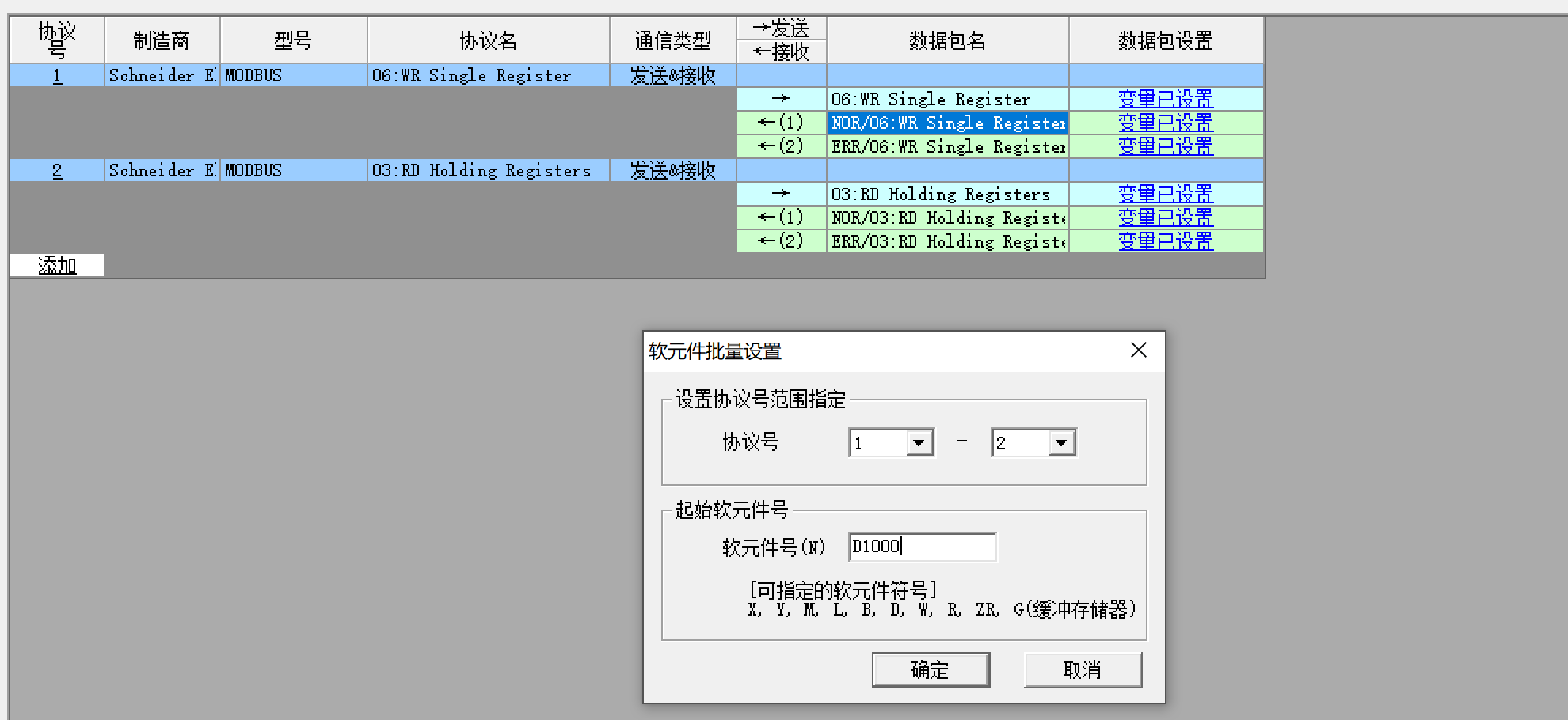 沒錯modbus,就選三菱已經集成的在制造商列表選擇施耐德 modbus,接著選擇你需要的功能碼 常用的03 06 功能碼等等多的很,注意可以添加多個協(xié)議號 到時候有相應的指令可以一起執(zhí)行 添加后可以右擊批量修改寄存器配置。方便的很。