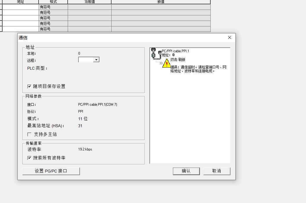 你設置PG/PC接口那里點開,本地地址應該選7,遠程地址即plc地址位2不用管,通訊比特率選擇9.6,點確定,最后雙擊刷新看看能不能搜索到plc,搜索到了點確定,表明電腦和plc通訊成功了